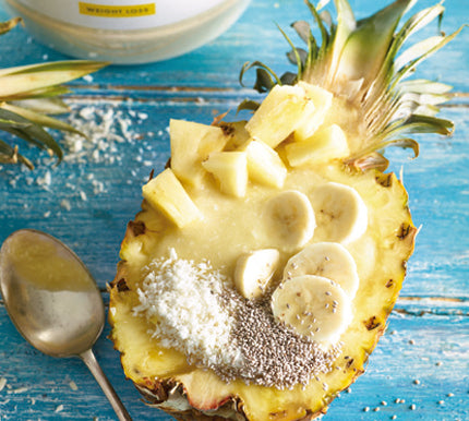 - Sirve en una de las mitades de la piña y adorna con coco rallado y semillas de chía